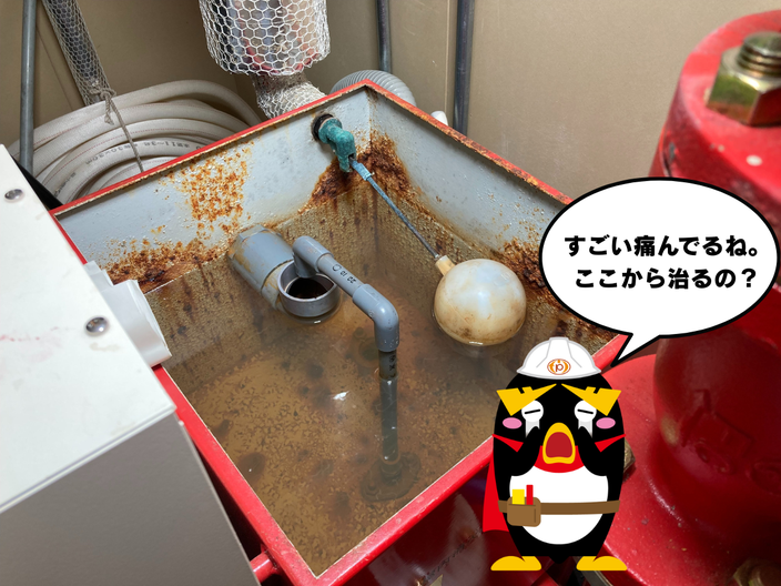 消火ポンプの呼水槽は、常に水を溜めているためどうしても錆が発生しやすい設備です。